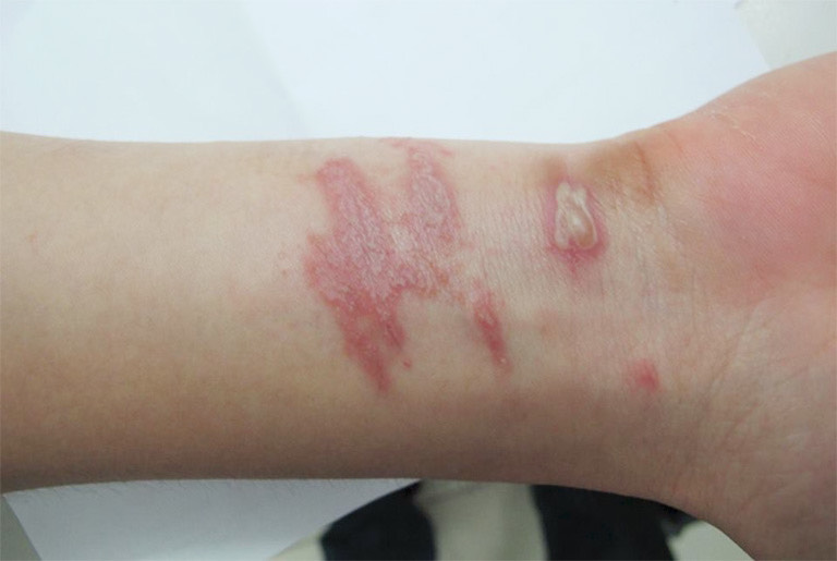 - Sau 6-12h, phát triển thành một đám hơi nề, đỏ cộm thành vệt, nổi những mụn nước to nhỏ không đều từ 1-5mm